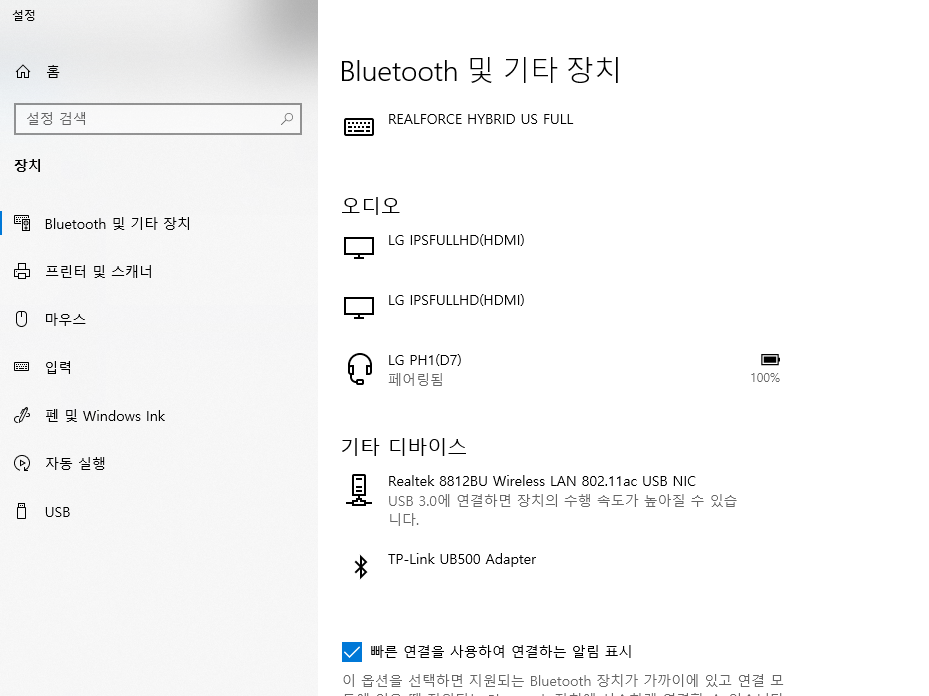 현재는 키보드, 블루투스스피커,무선이어폰,핸드폰윈도우연결 4가지를 연결해서 사용중이다.